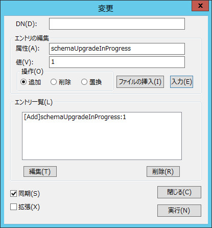 DN を空白。属性に schemaUpgradeInProgress 。値 1 。[入力] クリック